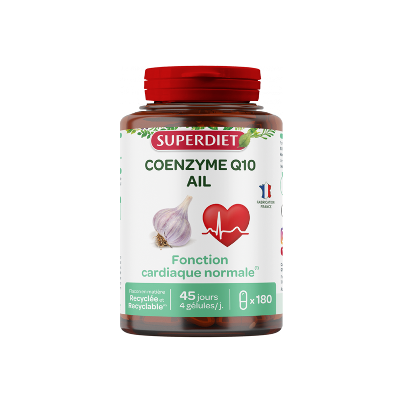 Amidon de riz, Gélule de gélatine de @poisson, Agent de charge : Gomme d'acacia, Co-enzyme Q10, Ail (bulbe).