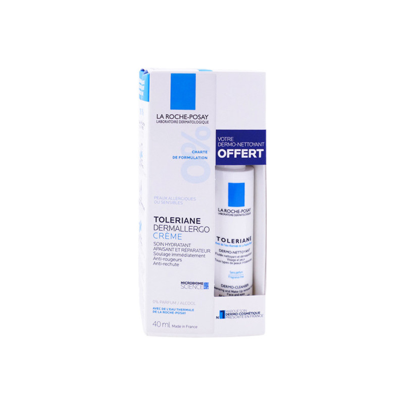- Dermallergo Crème : Aqua/Water/Eau, Isocetyl Stearate, Squalane, Butyrospermum Parkii Butter/Shea Butter, Dimethicone, Glycerin, Zea Mays Starch/Corn Starch, Pentylene Glycol, Butylene Glycol, Glyceryl Stearate, PEG-100 Stearate, Cetyl Alcohol, Salvia Miltiorrhiza Root Extract, Dimethiconol, Sodium Hydroxide, Sphingomonas Ferment Extract, Caprylyl Glycol, Citric Acid, Acetyl Dipeptide-1 Cetyl Ester, Acrylates/C10-30 Alkyl Acrylate Crosspolymer.