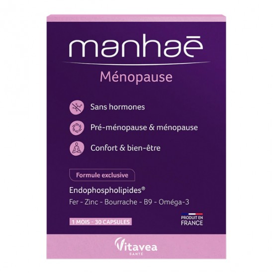 Manhaé Ménopause est un complément alimentaire, sa formule développée pour les besoins des femmes, repose sur une association unique : Endophospholipides®, fer, zinc, bourrache, vitamine B9 et oméga 3.