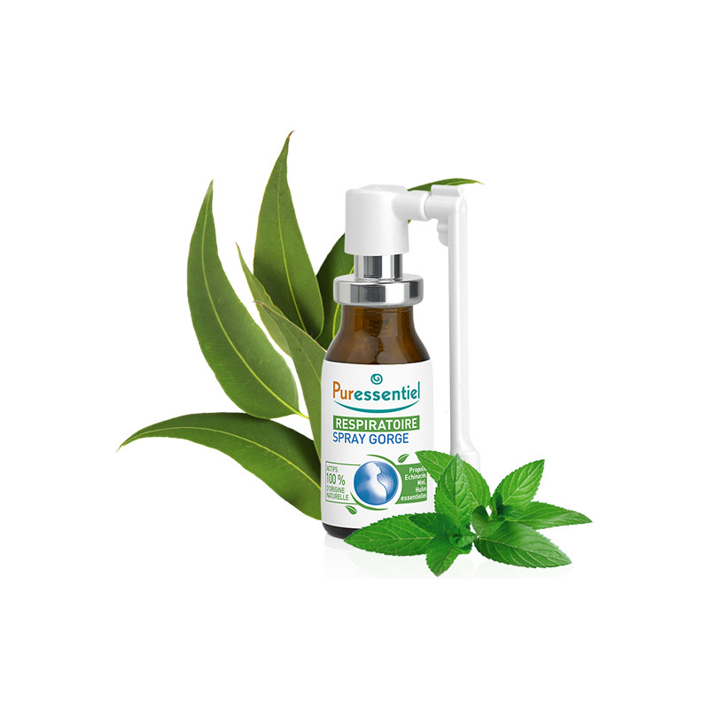 Le Spray Gorge Puressentiel Respiratoire contient de l'huile essentielle de menthe poivrée à l'effet apaisant sur la gorge, le pharynx et les cordes vocales, et de l'huile essentielle de thym qui aide au fonctionnement optimal du système respiratoire.