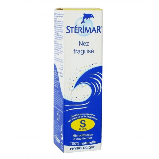 Stérimar Souffre nez fragilisé est une solution nasale en spray à base d’eau de mer qui s’applique par pulvérisations fines et douces pour un nettoyage efficace des fosses nasales.