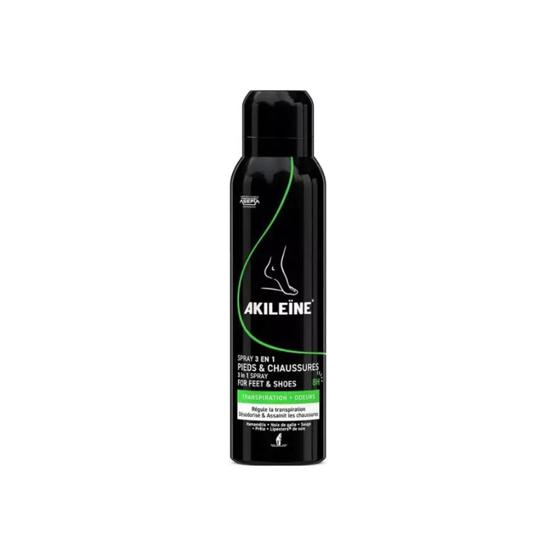 Le Spray 3 en 1 Pieds & Chaussures AKILEÏNE régule la transpiration excessive, désodorise et assainit l’intérieur des chaussures.