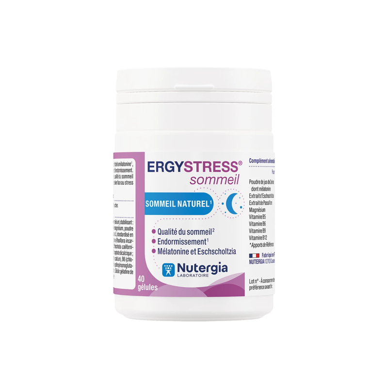 Ergystress Sommeil est composé de mélatonine issue de poudre de cerise standardisée, qui contribue à diminuer le temps d'endormissement et à atténuer les effets du décalage horaire. L'eschscholtzia et la passiflore favorisent la qualité du sommeil et aident à faire face au stress passager. La formule contient aussi des vitamines B et du magnésium marin.